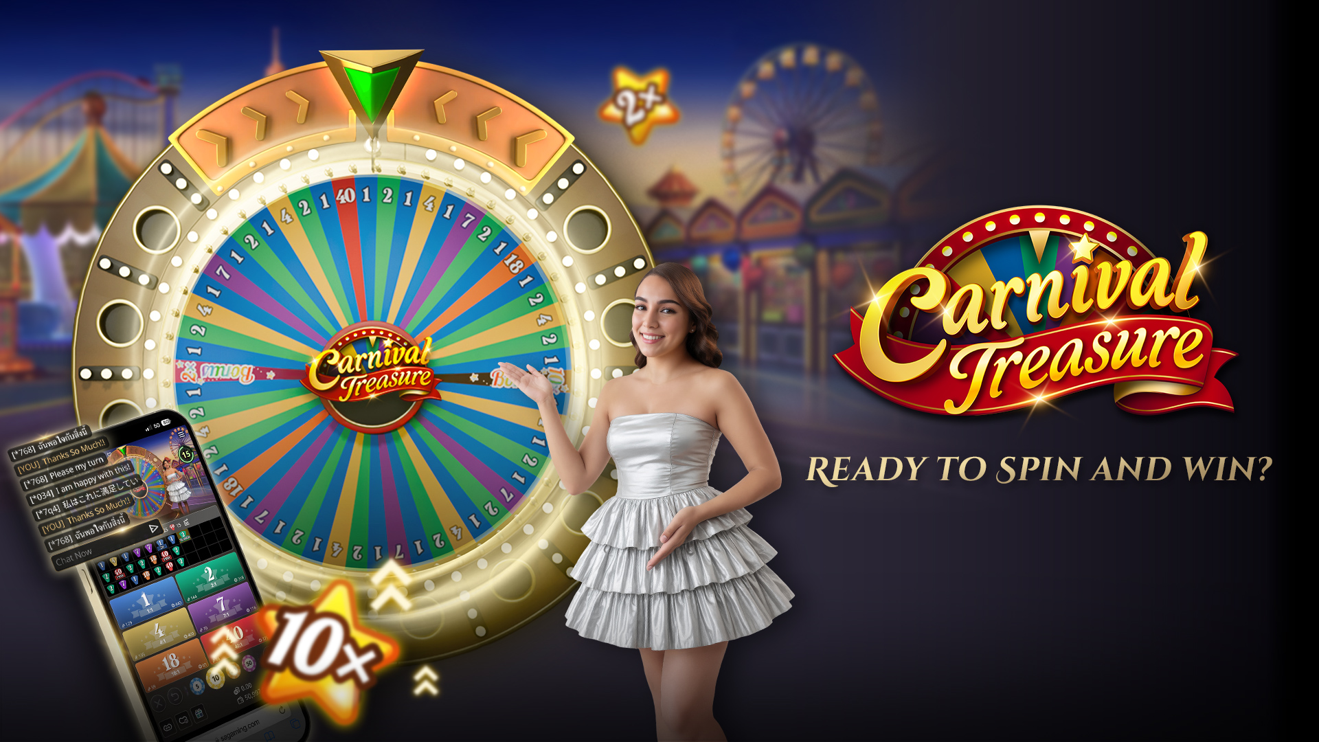 Carnival Treasure is a spectacular live game show where the game itself is a fast-paced and exciting money wheel game designed to bring players thrilling experiences. To win, players have to predict correctly which numbered segment the wheel flapper will land.